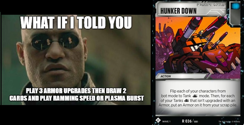 Setting up a situation where you use HK at its full capacity can happen quite easily. If you flip and attack with Demolisher on your first turn, you will have a minimum of 8 cards in your scrap pile after attacking and defending (up to +6 cards if you started second and flip into white pips). On your second turn, if you have HK in hand, you can flip Darkmount or Megatron first and play the action. You will have to resolve in order Hunker Down, Demolisher draw ability and then Megatron Ramming Speed or Darkmount Plasma Burst effect. If you do not have HK, you can still flip Demolisher to its Alt mod and draw two cards. You will notice that HK would let you play the armor upgrades from your scrap pile even if you do not flip any tank with the action card!
