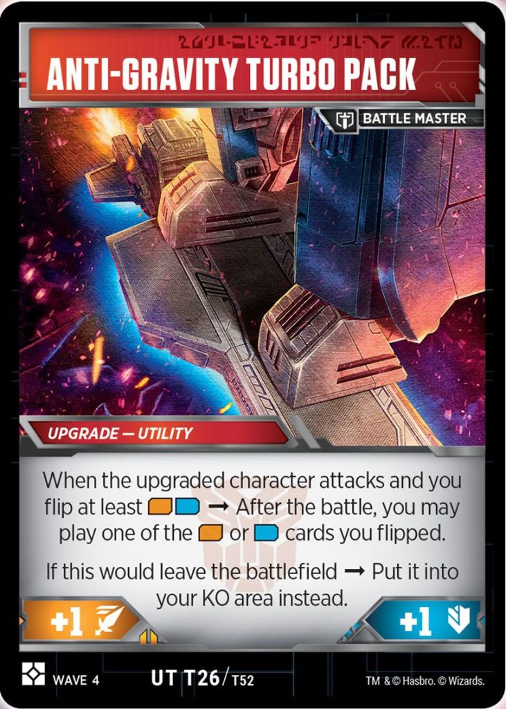 - You attack with General Optimus, using his inherent Focus and Bold to make it likely that the Anti-Gravity Turbo Pack’s ability activates. After the attack, you play one of the orange or blue cards you flipped (gaining an additional action or upgrade).