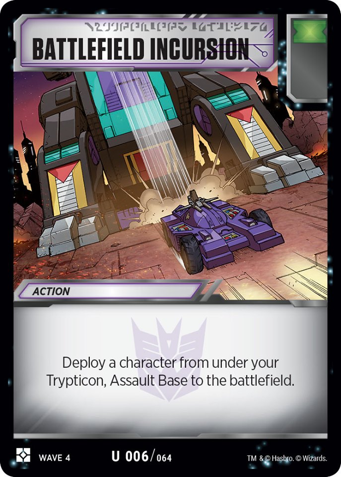But beyond telling a great story, Megatron backs it up with great stats and an even better ability. Because while some players are moving towards mixed decks, most tend toward all blue or orange; and they tend to use cards which will allow them to flip the most number of those cards. Which is exactly what Megatron wants. Flip 10 cards. Flip 20. Hope your opponent fills their hand with as many cards as they can. It only makes it easier for him to hurt them. Because the more often your opponent has to reshuffle, the more damage he’s doing to them. And at 12 stars, he leaves plenty of room for an old friend like Wave 1’s Shockwave or for new friends like Raider Caliburst (check out Wreck N Rule’s article on Uncommon characters for my thoughts on him) and Raider Needler; who each can help Megatron hurt your opponent in different ways and finally make them say: “All Hail Megatron”