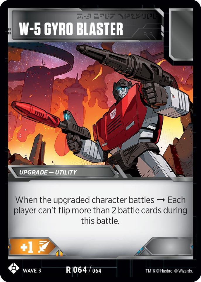 In the sideboard, W-5 Gyroblaster counters heavy blue decks that defend enough to be troublesome, and also works well against heavy-bold aggro (as fewer of my cards make use of bold than many aggro decks, plus it shuts down Kickback in Insecticons). Zap helps against safeguard characters, Skrapnel, and in plenty of little niche situations where the direct damage matters. Sturdy Javelin was intended for use with smokescreen but ended up a relative flop. Heat Of Battle is useful against another aggro deck, though I wasn’t too happy with it. Honestly, I would change out both Sturdy Javelin and Heat Of Battle for something else.