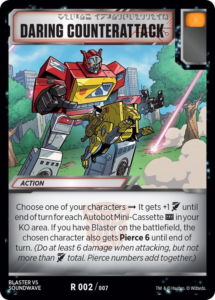 This Blaster deck to me was the obvious choice over things like Bugs, Cars, or Grimlock as an aggro build. All of them are powerful, but with less room for consistency due to cards needed to support the abilities of the characters and theme rather than focusing purely on damage output and countering opponent’s strategies. Bugs doesn’t protect itself beyond Skrapnel’s ability, and Swarm deals damage for which the opponent gets to choose the target. Grimlock requires too much setup for a big swing to take advantage of his damage overflow ability. Cars needs too much support for their untap cards and the draw to get them, with characters that are too fragile as a 4-wide and too little damage overall as a 3-wide. Blaster with his cassettes and Prowl works without wasting deck slots for support of character abilities or overall deck strategy, leaving the player free to focus on implementing battle cards that maximize damage and response to OTHER decks.