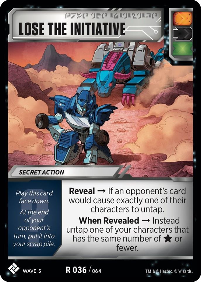 Lose the Initiative however, would be a perfect card for this. Now your opponent’s untaps are yours and they can’t get around it by simply just not playing that card this round. Hijack, Scavenge the Battlefield, Speed Trap, all would benefit from waiting to be used at the proper time and your opponent not being able to dance around them. It even makes Take Cover usable, since now it lasts through the round til you need it.