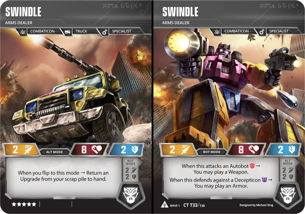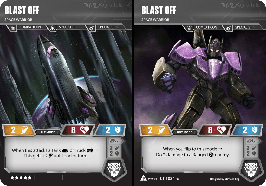 While not known for the competitive edge in the game, Combiners have always been an extremely fun mechanic for me. I’d played a lot of Aerialbots so I know these Cons (or Mercs) would need to be similar, yet stand on their own as a team…. and as individuals within other teams. They’re meant to be a powerful military unit and versatile to combat against many different opponents. Wave 1 of the Ark will introduce the first Mercenary combiner, and also a variety of battle cards that will give any combiner some new twists to help them be a bit more competitive. Coming in at only 24 stars, there’s room for a star card of your choice.