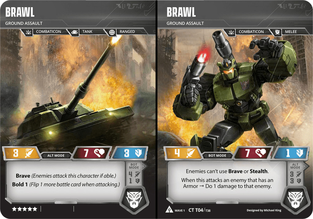 In his alt mode, he’s very durable with a defense of 3, which in tangent with being Brave will soak up a few attacks. On the offensive, he also hits fairly hard and carries Bold 1, so in most cases he may be who you lead with when attacking. Once in bot mode, there’s no hiding from him or the rest of the Combaticons, as Brawl negates an opponent’s Stealth and Brave. In addition, any enemy using Armor gets an automatic Zap when attacked by Brawl.