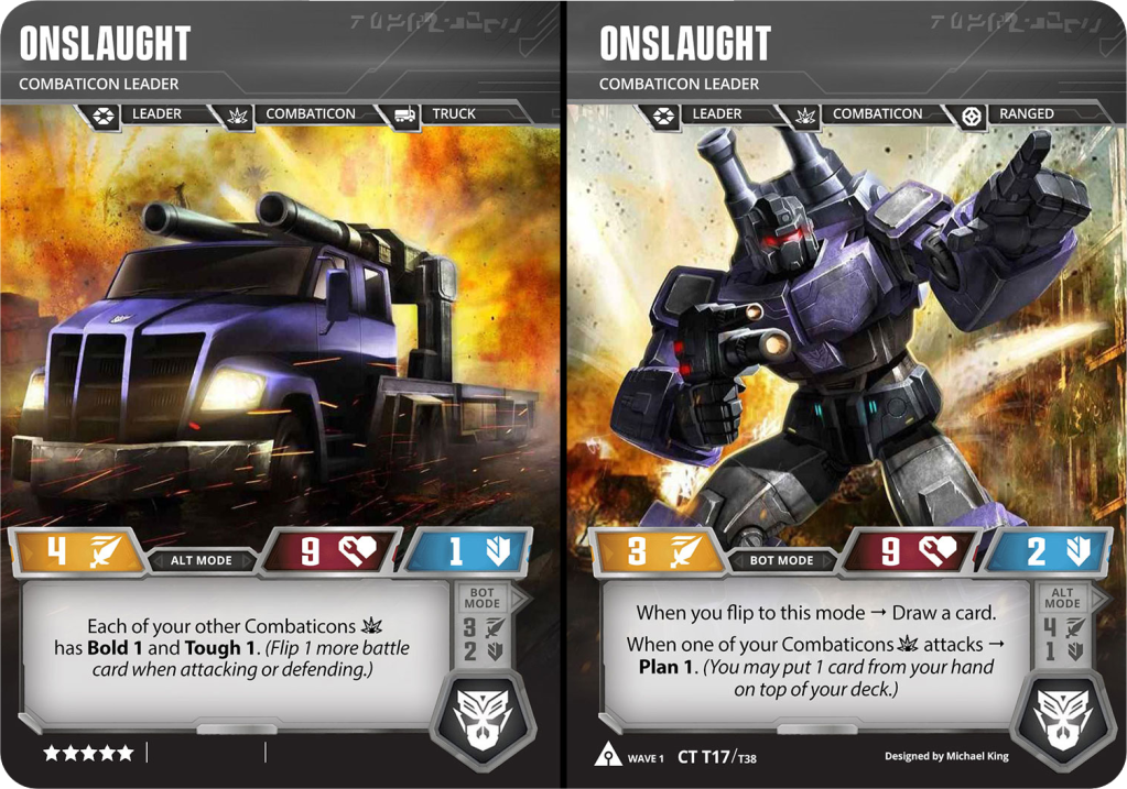 The Combaticon Leader starts the game by giving each of the other Combaticons both Bold 1 and Tough 1, a pretty sweet advantage right out of the gate. So long as he survives long enough, that advantage will last throughout most of the game as he’d typically be your last Combaticon to transform. Upon flipping, he gives you a card draw, and in grand fashion another Combaticon a chance to Plan 1.