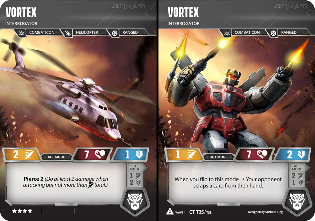 With his Pierce, Vortex is always guaranteed to do some damage in alt mode. When you flip him to bot mode, you’ll force your opponent to rethink their card play as they’ll have to scrap a card from their hand. Vortex is also the first 4 star Helicopter in the game, making him playable with Tidal Wave for more versatility in those decks.