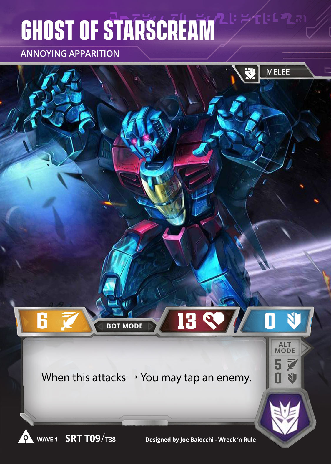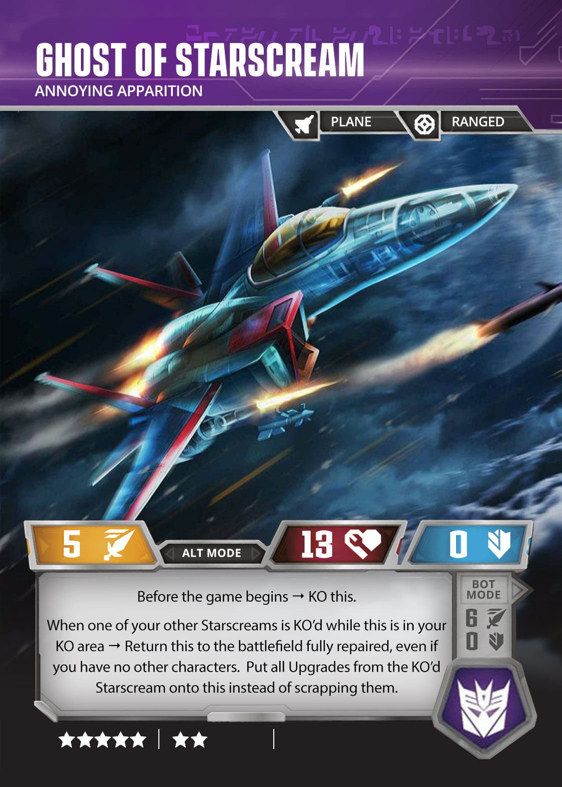 When one of your other Starscreams is KO’d while this is in your KO area ->. Any Starscream you have regardless of adjective such as Captain or…….Ghost. Reminder, Ghost of Starscream needs to be in alt mode in the KO area for this to trigger.