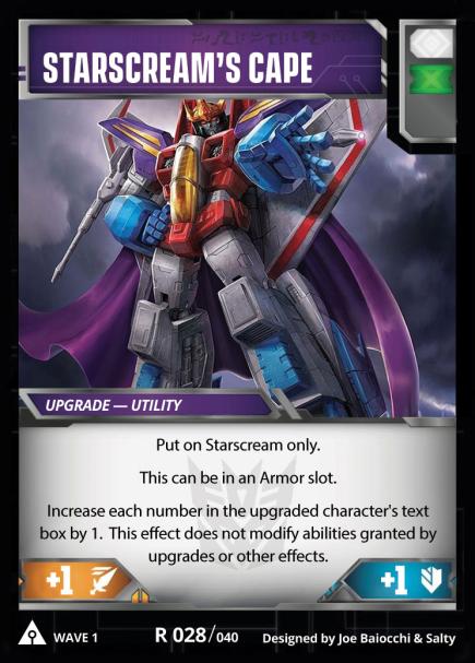 Increase each number in the upgraded character’s text box by 1. Starscream-Scheming Second-in-Command will gain Bold 1 per cape in alt mode and Tough 1 per cape in bot mode. Starscream-Air Commander will gain Bold 1 per cape in bot mode. Starscream-Decepticon King will get +1atk/+1def per cape per Decepticon Crown flipped when battling. A possible +5/+5! Starscream-Decepticon Lieutenant will gain Tough 1 per cape in bot mode. Captain Starscream-Infantry-Air Commander will deal 2 damage to an enemy that has no upgrades with 1 cape and 3 damage per enemy that has no upgrades with 2 capes in alt mode. In bot mode, he will deal 2 and 3 damage depending on how many capes he has equipped.