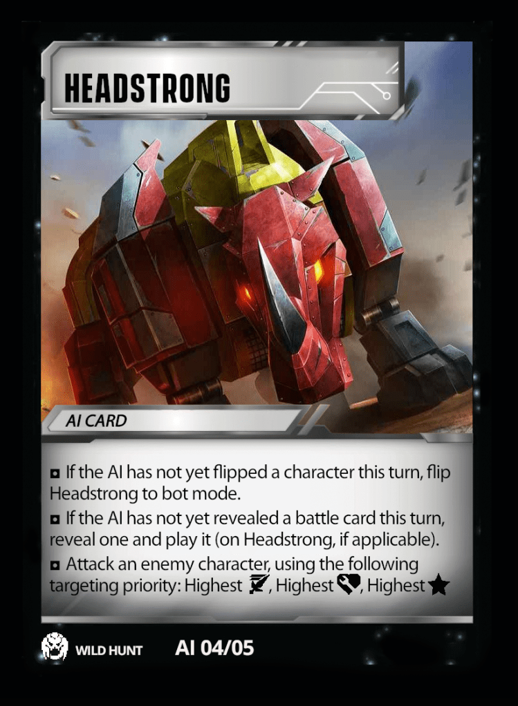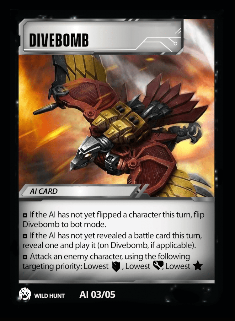 I wanted the targeting to also be both predictable and unpredictable. After you’ve played against it once, you know how each different Predacon prioritizes its target. In the above case, Razorclaw will attempt to attack the available target with the highest star count. In the event of a tie, it will then go for the available target with the highest ATK value. In the event that there is still a tie, it will go for the available character with the highest HEALTH value. In the unlikely event there is STILL a tie, the target is randomly determined (roll a die, flip a coin, etc.).