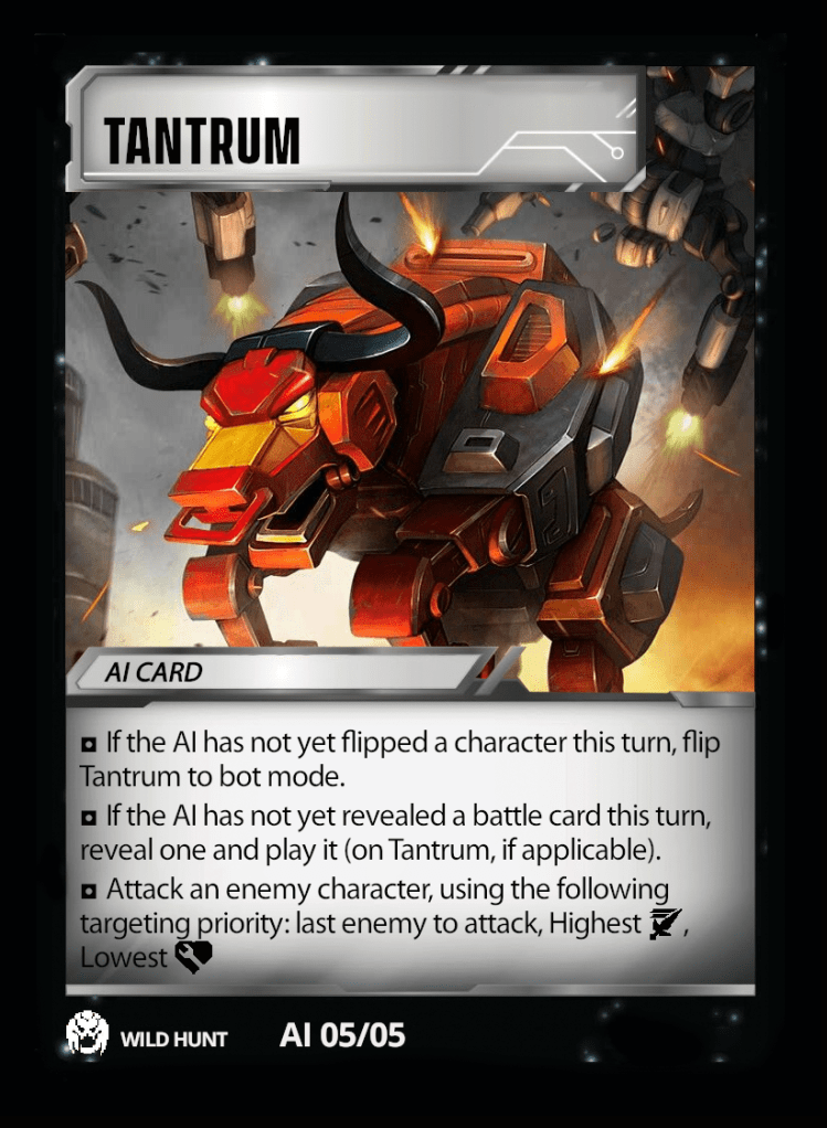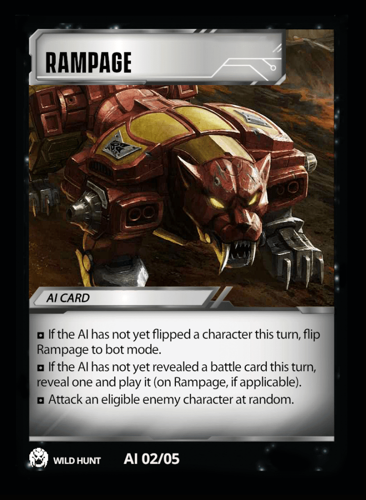 I’m also attempting to streamline any additional rules text that might be necessary, hence why the AI cards also instruct the player to flip the indicated character if no other character has been flipped by the AI this turn, and to reveal and play a battle card if the AI has not yet played one this turn. In this way, it will mimic a typical game, where if the AI’s opponent is totally tapped out, they will only get 1 flip and 1 battle card. There will be another mechanism that will allow the AI to play additional battle cards as the game progresses, but I’ll talk more about that in the next article (which hopefully won’t take another two months to write). In the initial version of this scenario, I’m keeping the AI to one battle card played during its turn in order to simplify things. As the scenario ramps up, the AI will have the opportunity to play more.