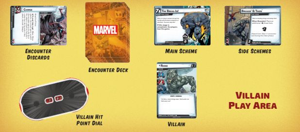 In Marvel Champions, the win condition is to defeat all stages of the main villain. Along the way, you need to contest with schemes that begin in play or which enter play later, always designed to make the player’s life more difficult. The Encounter deck can spit out additional minions, side schemes, or attachments to power up the villain, along with Treachery cards which function in a similar way to LOTR. On top of that, if the Encounter deck ever runs out and needs to be reshuffled, the main scheme gets an acceleration token which causes additional threat to be placed upon it, hastening a possible game loss if the main scheme is ever completed.