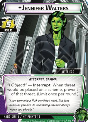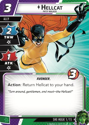 Hellcat is a little bit of a bummer with a cost of 3 (especially since Shulkie only has a hand size of 4 in hero mode). At the same time, 2 THW for an incidental damage isn’t shabby at all, and the possibility of returning her to your hand before she gets defeated to use her as a resource is a neat little way to squeeze some additional efficiency out of an ally outside of attacking, thwarting, or chump blocking.