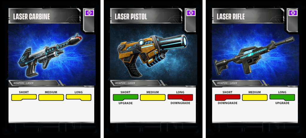 Another example of this is how certain weapons have ideal or less than ideal conditions for use. Most characters will start with the bog standard Laser Carbine, which doesn’t get any upgraded dice at any range, but also doesn’t get downgraded dice at any range. On the other hand, Laser Pistols are more effective up close and less effective at a distance, so a typical character would get their attack dice upgraded to d8s while shooting at short range and downgraded to d4s if shooting at long range. Laser Rifles are the exact opposite.