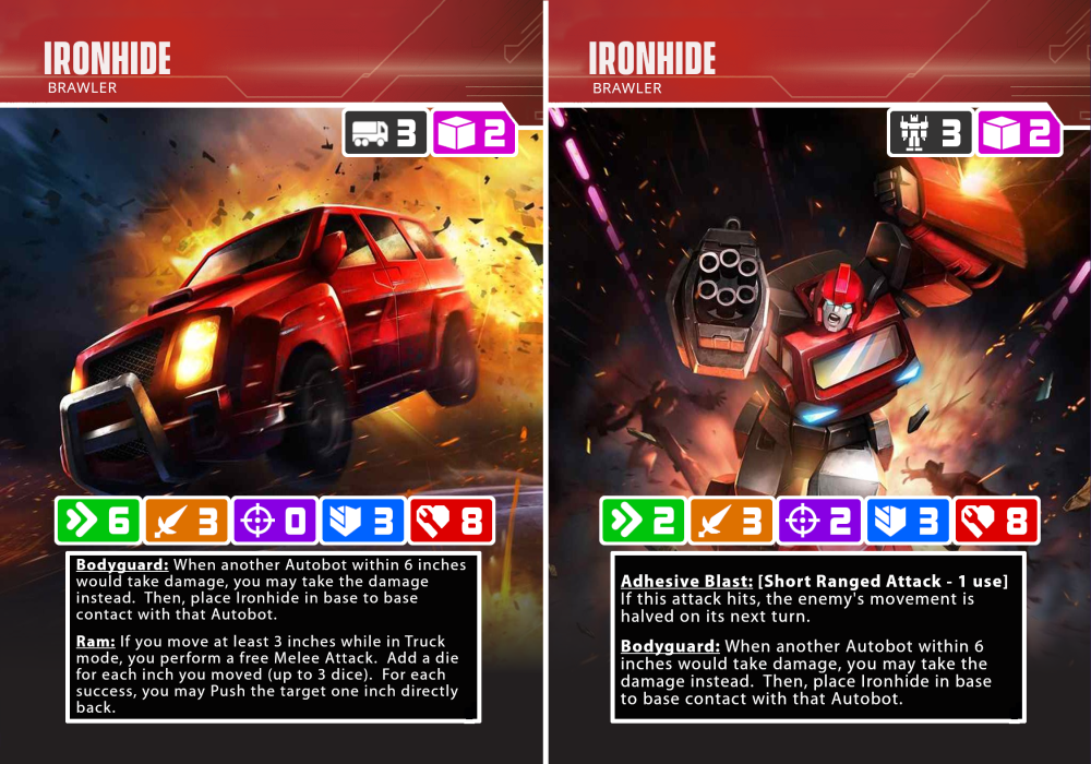Finally, Ironhide is often shown stepping in to take shots intended for other Autobots (Prime in particular). His old Transformers Universe profile even describes him as Prime’s bodyguard. This manifests in game as a way to absorb damage that would’ve been inflicted on his teammates. For any old X-Wing Miniatures Game players, this is heavily inspired by Biggs Darklighter’s pilot ability.